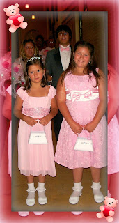 This is after the wedding in all of our Pink glory except for my little sister Laurie who looked absolutley smashing in her off the shoulder black dress. Bottom row left to right: My dear friend Ty (my bridesmaid), my niece Mikaela (Laurie's daughter), my niece Camille (Laurie's daughter), my niece Marissa (Cyndi's daughter). Top row left to right: My best friend Mary Anne (Matron of Honor), my sister Laurie, Me, my sister Cyndi and my sweet mother Rosa. Missing was my dear friend Veronica as she and her husband had already taken off to change for the wedding reception.